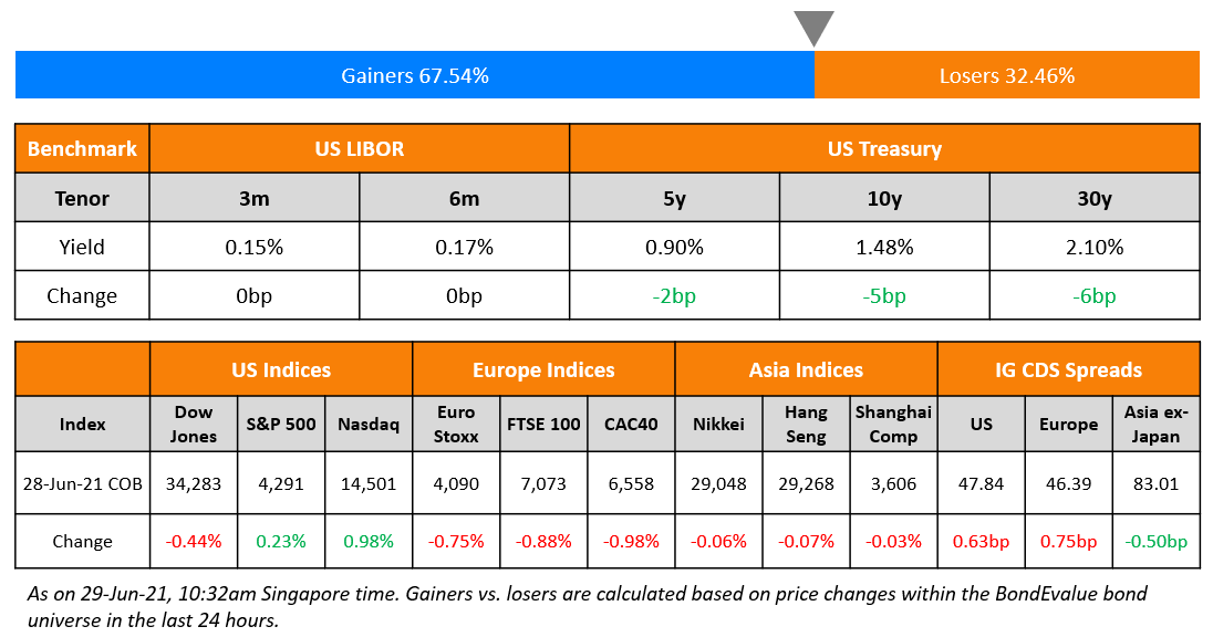 US markets continued their strong run boosted by tech stocks, which helped Nasdaq close higher by 1% to reach another record. S&P also set a record, gaining 0.2%. IT was up 1.1% while Energy and Financials lagged, down 3.3% and 0.8%. US 10Y Treasury yields eased by 5bp to 1.48%. All eyes are now set on Friday’s job report by the Labor Department where economists expect NFP to increase by 683k in June, topping the 559k reading for May. European bourses witnessed a fall after the increased number of Covid cases and the likelihood of EU banning British tourists pulled down travel stocks. CAC, FTSE and DAX were down 1%, 0.9% and 0.3%. US IG and HY CDS spreads widened 0.6bp and 2.9bp respectively. EU main and crossover CDS widened 0.8bp and 4.8bp respectively. Saudi TASI was down 0.1% while Abu Dhabi’s ADX was up 0.6%. Brazil’s Bovespa was up 0.1%. Asian markets opened in the red – Nikkei is down 0.9%, Singapore’s STI down 0.8%, Shanghai down 0.6% and HSI down 0.5%. Asia ex-Japan CDS spreads were 0.5bp tighter. Another busy day at the primary markets with 11 new dollar deals dominated by Chinese local government financing vehicles (LGFVs).