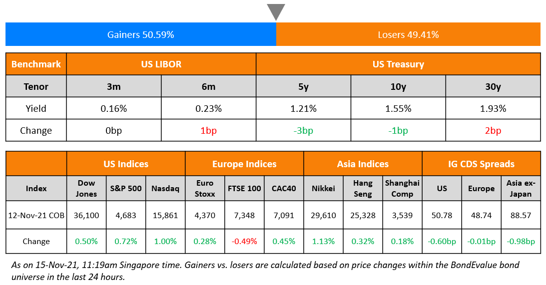 US equities ended slightly higher with the S&P up 0.7% and Nasdaq up 1%. Sectoral gains were led by Communication Services and IT, up 1.7% and 1.2% respectively. US 10Y Treasury yields were 1bp tighter at 1.55%. European markets were mixed with the DAX and CAC up 0.1% and 0.5% while FTSE ended 0.5% lower. Brazil’s Bovespa ended 1.2% lower. In the Middle East, UAE’s ADX was up 0.7% and Saudi TASI was up 0.1% on Sunday. Asian markets opened broadly mixed – Shanghai and HSI are down 0.3% and 0.1% while STI and Nikkei were up 0.2% and 0.4% respectively. US IG and HY CDS spreads were 0.6bp and 1.5bp tighter. EU Main CDS spreads were flat and Crossover CDS spreads were 0.7bp wider. Asia ex-Japan CDS spreads tightened 1bp.