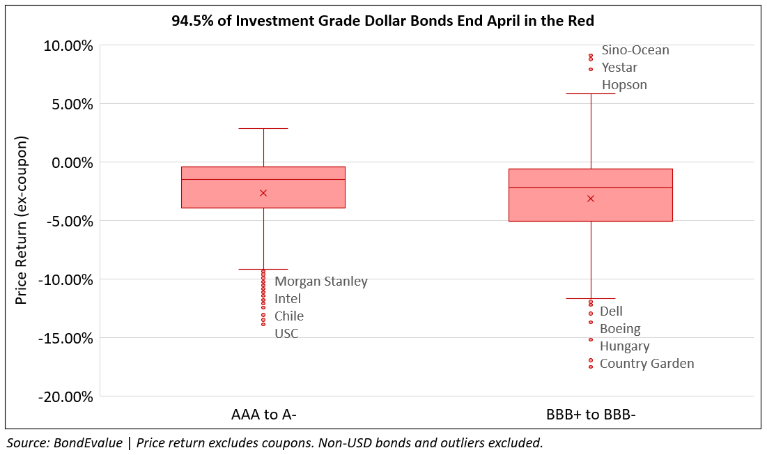 Dollar bonds in our universe dropped again in April, with 88% of bonds in the red. Investment grade (IG) bonds – more sensitive to interest rate changes compared to high yield (HY) bonds, all else equal – were the most impacted. 95% of investment grade dollar bonds ended April in the red, compared to 78% of high yield dollar bonds that ended the month lower. The move in the IG space comes after US 10Y Treasury yields jumped over 59bp through the month, from 2.34% on March 31, to 2.93% at end-April. The US 2s10s yield curve steepened from -6bp on March 31 to 36bp in mid-April, post which it retreated to 18bp. This was after headline inflation continued to pick up in the US, accelerating 8.5% YoY in March.