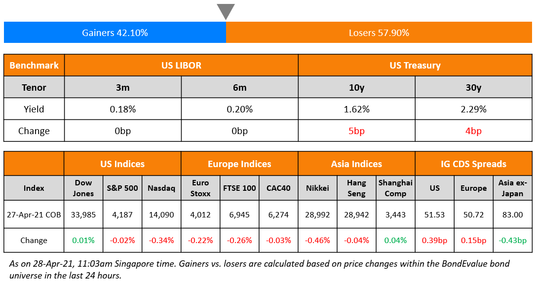 S&P ended flat while Nasdaq fell 0.3% with Tesla dropping 4.5% despite strong earnings. US 10Y Treasury yields were 5bp higher to 1.62% even after a decent 7Y Treasury auction ahead of the FOMC meeting scheduled for later today. European equities were modestly lower with the FTSE and DAX down 0.3% each. US IG CDS spreads were 0.4bp wider and HY widened 1bp. EU main CDS spreads were 0.2bp wider and crossover spreads widened 0.7bp. Asian equity markets are trading mixed today and Asia ex-Japan CDS spreads tightened 0.4bp.