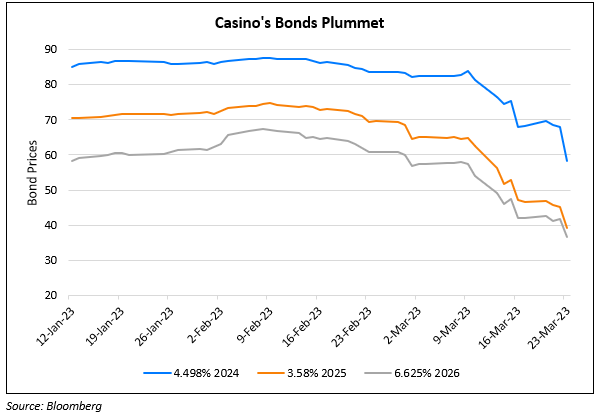 Casino Guichard’s bonds were down by over 4 points across the curve after its downgrade to Caa1 from B3 by Moody’s. The downgrade came on the back of continued market share losses, a reduction in French retail margins in 2022 and weak liquidity. Moody’s said that Casino’s leverage was “very high” with adjusted debt-to-EBITDA above 7x. Also, its French operations saw a cash burn of €900mn in 2022. The rating agency notes that the above partly offsets the progress Casino has made with recent asset disposals. Casino has to rely on asset disposals to repay its bond maturities and Moody’s expects it will do the same in order to repay its bonds due 2024. Moreover, with the sale of a controlling stake in Brazilian subsidiary Assai, Casino is reducing its geographical diversification – this increases the risk of exposure to the French market.