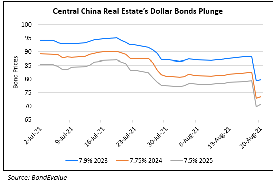 Dollar bonds of Central China Real Estate (CCRE) tanked by as much as 12% after the property developer reported its half yearly results which showed a sharp rise in its net debt ratio and a slump in cash. Its net borrowings totaled CNY 11.8bn ($1.8bn) with its net debt ratio soaring to a massive 92.6% in 1H2021 from 13.6% a year ago. Its cash, cash equivalents and restricted bank deposits fell 44% to CNY 16.5bn ($2.5bn). CCRE’s gross profit margins declined to 17.9% in 1H2021 from 23.7% in 1H2020. On the positive front, revenues rose 56.4% YoY to CNY 20.4bn ($3.1bn) and profits for the first half came in at CNY 1.03bn ($160mn), up 30.4% YoY. Impairment losses decreased from CNY 95mn ($14.6mn) in the prior year’s corresponding period to $35mn ($5.4mn) as at end-June 2021. CCRE said that they continue to “implement a prudent approach to acquire land and accelerated the project construction progress so as to shorten the development cycle”.