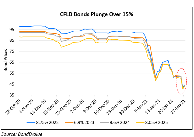 China Fortune Land Development’s (CFLD) dollar bonds took another beating with most of them now trading in the 40’s falling 11 cents on the dollar yesterday. The 8.625% bond due February 2021 was hit the hardest, dropping a record 17.7 cents on the dollar, but have recovered now to 65.4 from 59.34. Bloomberg news cited Reorg Research reporting that China International Capital Corp. (CICC) and King & Wood Mallesons (KWM), have been brought in to get familiarized with the developer’s situation. Sources said that CICC and KWM have started due diligence at CFLD to address debt issues. While CFLD prefers to reach an out-of-court agreement, there’s no certainty creditors will agree to its proposal, the people said.