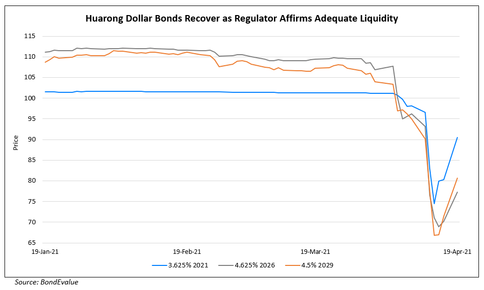 An official from the CBIRC, China’s regulator, commented on China Huarong Asset Management Company (CHAMC) stating that “operations at Huarong remain normal and the company has ample liquidity”, as per Caixin. This is the first official comment after CHAMC’s dollar bonds tumbled since the beginning of the month post delaying its earnings release. Bonds of CHAMC recovered some of the losses after the statement.