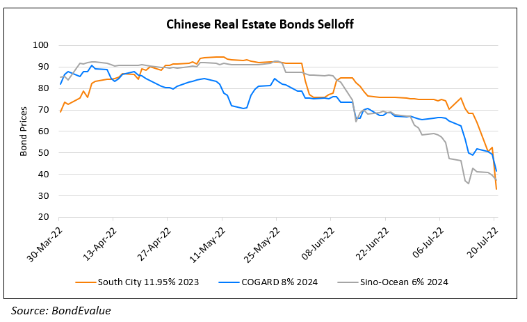 Chinese real estate dollar bonds have slid across the board led by China South City, with relatively higher rated developers like Country Garden (Ba1/BB+/BBB) and Sino-Ocean (Baa3//BBB) in tow. Bloomberg notes that the most recent bond selloff in the sector is a reflection of investors’ concerns following mortgage boycotts happening all across China. While the government has stepped in to help, there are mounting fears that the current situation reflects deeper problems within the Chinese property sector that cannot be resolved with traditional policy adjustments. In particular, South City’s dollar bonds fell the most amid reports that it is mulling a maturity extension for all its offshore bonds totaling $1.59bn, despite receiving state support.