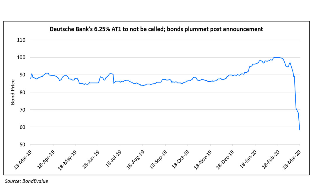 Additional Tier 1 (AT1) bonds of banks tumbled yesterday after investors scrambled to offload. Commonly called CoCo bonds (Contingent Convertible), these bonds will be the first in line after common stock to “absorb losses” if the financial institution that issued it runs into financial distress and a declines in levels of common equity. Notably, Deutsche Bank’s 6.25% USD 1.25 bn AT1 bonds that were trading at par just over a month ago are now trading below 60. Following from last week’s announcement by DB that they would not be calling this AT1 bond.
