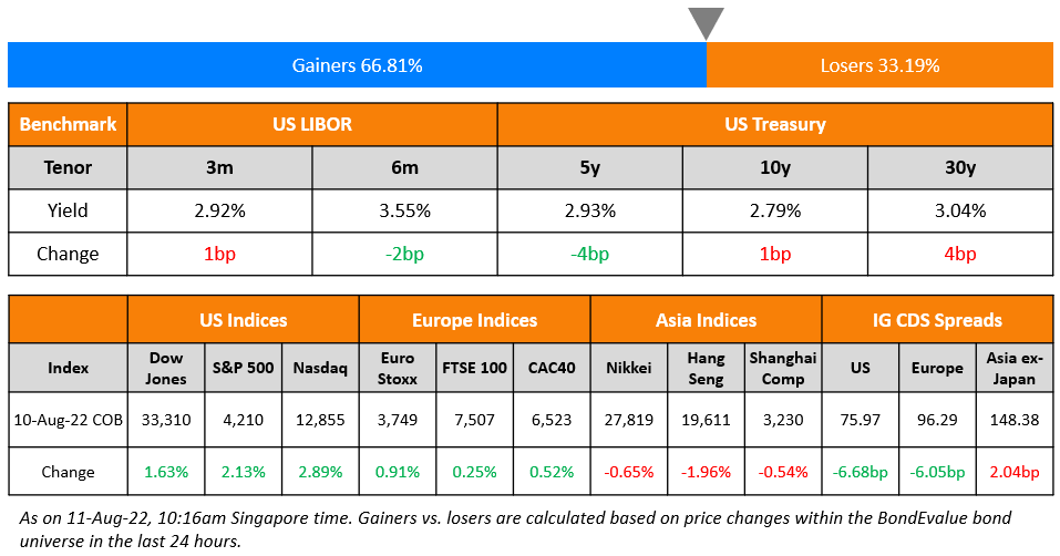 US equity markets witnessed a strong rally on Wednesday as July inflation eased (details below) – the S&P and Nasdaq rose 2.1% and 2.9% respectively. Sectoral gains were led by Materials and Consumer Discretionary, up 2.9% each. US 10Y Treasury yields rose 1bp to 2.79%. European markets moved up as well – DAX, CAC and FTSE rose 1.2%, 0.5% and 0.3% respectively. Brazil’s Bovespa was up 1.5%. In the Middle East, UAE’s ADX and Saudi TASI rose 0.8% each. Asian markets have opened broadly higher – Shanghai, STI and HSI were up 1.2%, 0.5% and 1.9% respectively while Nikkei was down 0.7%. US IG CDS spreads tightened 6.7bp and US HY spreads were tighter by 38.2bp. EU Main CDS spreads were 6bp tighter and Crossover spreads were tightened by 33.8bp. Asia ex-Japan IG CDS spreads were widened 2bp.