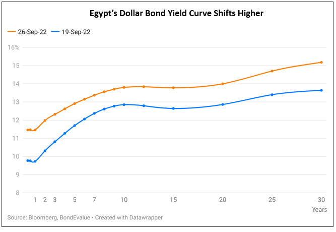 Egypt’s dollar bonds have been trending lower over the past week with some bonds down ~4% on Friday. The move across the curve comes as the North-African economy is currently facing difficult times with inflation at ~15%, having been impacted by the Russia-Ukraine war. As seen in the chart below, dollar bond yields have risen by 100-150bp across the curve, with larger moves seen in the short- and long-end.