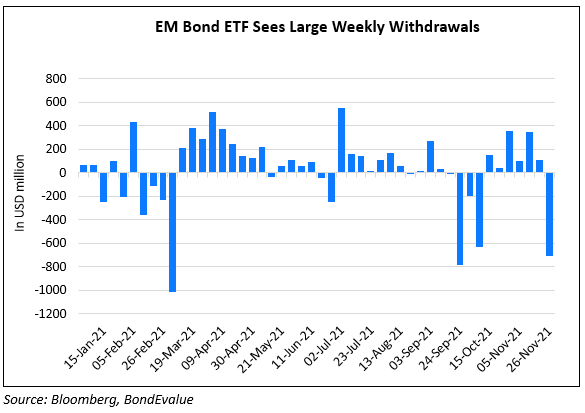 The iShares JP Morgan USD Emerging Markets Bond ETF saw $709.5mn in outflows in the week ended November 26, the biggest withdrawal in two months. The withdrawals coincided with a 2.6% drop in the ETF, the worst week since March 2020. Bloomberg notes that most of the withdrawals came on Tuesday, a day after Fed Chair Jerome Powell was reappointed for a second term. Powell being reappointed is considered hawkish, expecting a quicker pace of monetary tightening. The other chunk of withdrawals came on Friday after the Omicron variant worries spooked markets. Citigroup strategists note, “We can’t see a positive environment for EM, as many EM countries will be last in line for vaccine that might be produced to counteract”.