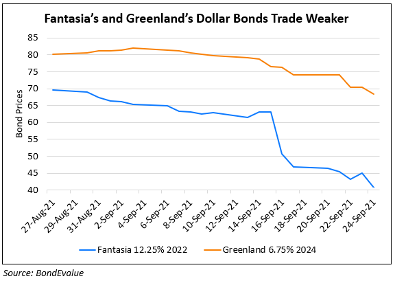 Dollar bonds of Evergrande’s peer fell again with some bonds of Fantasia down over 10% and those of Greenland Holdings’ fell about 2-4% as concerns grow over Chinese developers’ financial position.