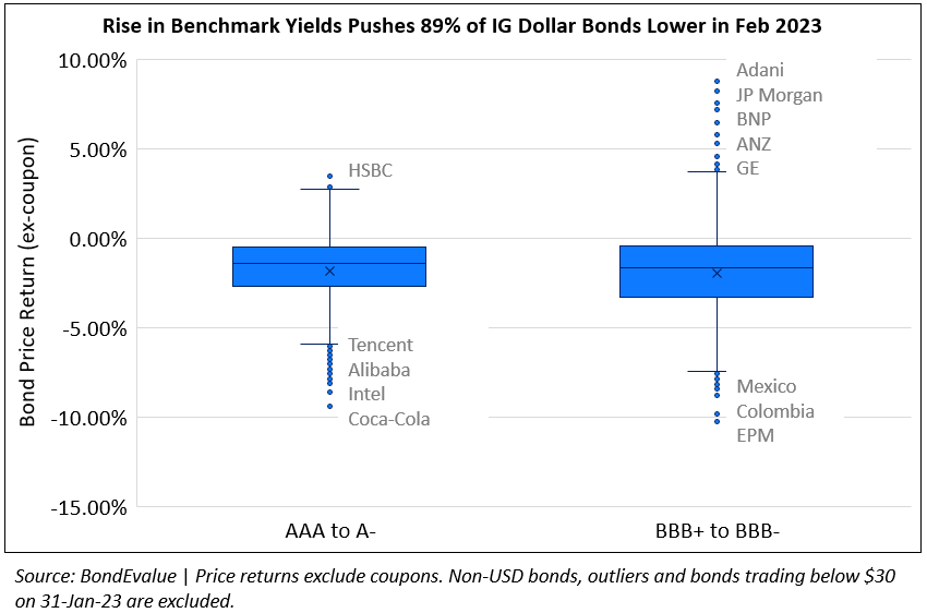 The move higher across benchmark yields especially saw IG bonds underperform due to its greater duration sensitivity. Among the few gainers in the IG space were bonds of Adani Group that recovered during the month - this was led by Adani Green's 2024s after the company said that it will come up with a plan to refinance its bonds. In the latest update after conducting roadshows in Singapore and Hong Kong, Adani's CFO said that it was not seeking to refinance debt or inject capital. As per attendees of its roadshows, executives said that the Adani group has enough money to repay debt due over the next three years in addition to an $800mn credit facility. Separately, floating rate perpetual bonds of banks like BNP Paribas and ANZ with resets coming up; the bonds rose by 7-8% through the month, given their low sensitivity to rates. The losers list saw high duration/long tenor of highly rated corporates like Coca-Cola, Berkshire Hathaway, Alphabet, Alibaba, Dell, Oracle and others fall by over 7% during the month. LatAm sovereigns like Mexico and Colombia also saw their bonds down over 10%.