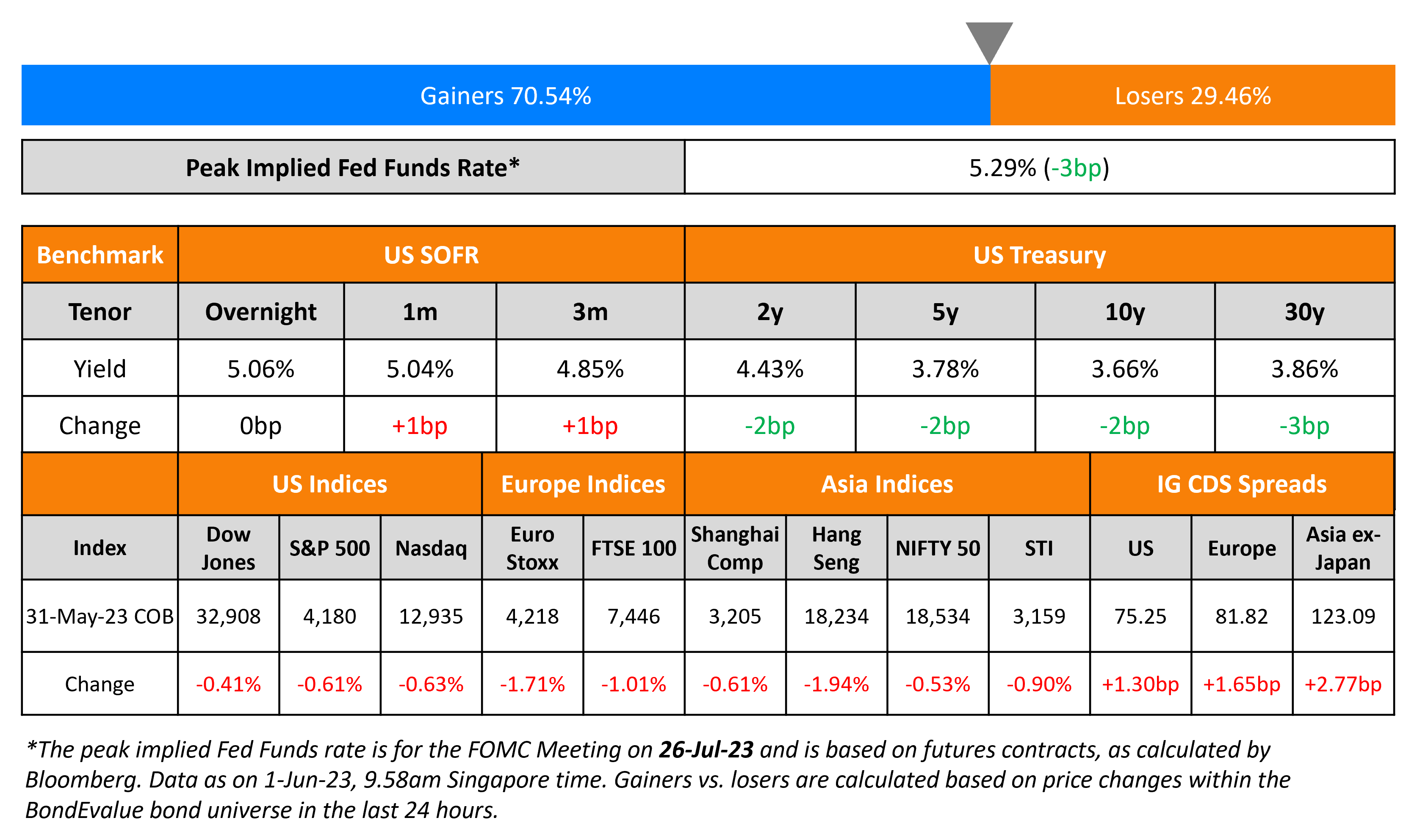 US Treasury yields were marginally lower by 2-3bp across the curve. Fed Governor and Vice-Chair Philip Jefferson hinted that the Fed may skip a rate hike at the June meeting and his remarks were also echoed by Philadelphia Fed President Patrick Harker (scroll below to the Talking Heads). This led to a big shift in CME probabilities for a Fed rate hike – markets are now pricing in a 60% chance of a status quo in June vs. a 60% probability of a 25bp hike in June yesterday. The peak Fed Funds Rate fell 3bp to 5.29% for July. Separately, the House passed the debt-limit legislation, which will now be sent to the Senate where the Democrats have a narrow majority, before President Joe Biden can sign it into law. Equity indices were slightly lower with the S&P and Nasdaq down by 0.6% each. US IG and HY CDS spreads widened 1.3bp and 7.1bp respectively.