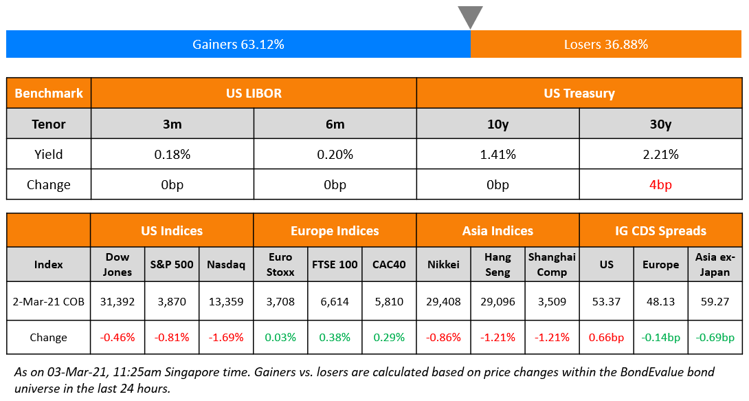 After a respite on Monday, US equities closed in the red on Tuesday with the S&P down 0.8% and Nasdaq down 1.7%. US 10Y Treasury yields eased 3bp with the risk-off tone. While Wall Street moved lower, Europe’s FTSE, DAX and CAC 40 rose 0.4%, 0.2% and 0.3%. After CDS spreads saw a sharp contraction on Monday, the moves were muted yesterday. US IG CDS spreads were 0.7bp wider and HY was a 4.3bp wider. EU main CDS spreads tightened 0.1bp and crossover spreads widened 1.3bp. China’s Caixin Services PMI came at 51.5 for February, slightly lower than the January’s print of 52. Asian equity markets are up 0.5% and Asia ex-Japan CDS spreads are tighter by 0.1bp.