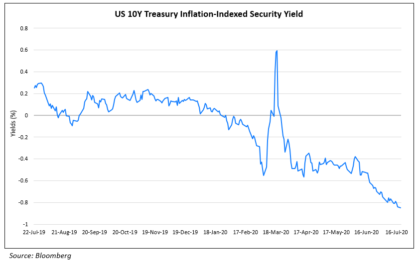 Expectations of higher inflation are supported by a recovery in global trade and commodity prices. Iron ore, a key ingredient in steelmaking has now overtaken gold with a return of 21% this year vs. 19% for gold, as per the FT. The Treasury will be selling $14bn of 10Y TIPS later this week, which will give a sense of investor demand for such securities. “The decline in real yields and the bid for safe-haven assets, such as gold, is another troubling signal of uncertainties ahead,” Subadra Rajappa, head of U.S. rates strategy at Societe Generale wrote in a note. Greg Peters, head of multi-sector and strategy at PGIM Fixed Income echoed, “The fall in real yields speaks to the challenged growth environment going forward. What the bond market is telling you is that growth will be sub-par for quite some time.”