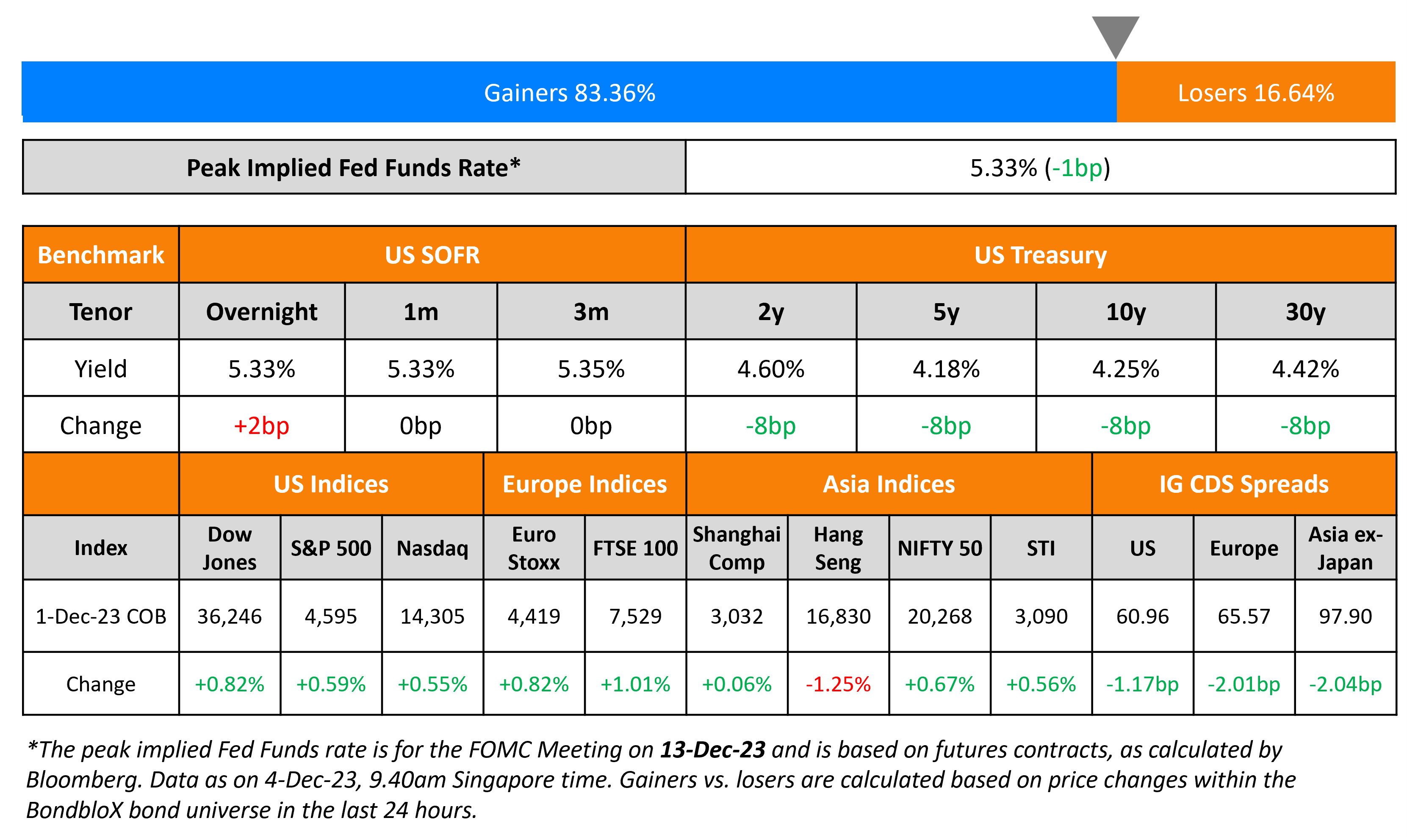 US Treasury yields were down by 8bp across the curve on Friday. Fed Chairman Jerome Powell noted that policy is “well into restrictive territory”, though the central bank is ready to hike further if needed. Separately, US ISM Manufacturing PMI was unchanged at 46.7 last month, the thirteenth consecutive month that the PMI stayed below 50, indicating a contraction in manufacturing. US credit markets saw IG CDS spreads tighten 1.2bp and HY tightening 6.7bp. Equity markets ended the week in the green, with the S&P and Nasdaq up ~0.6% each.