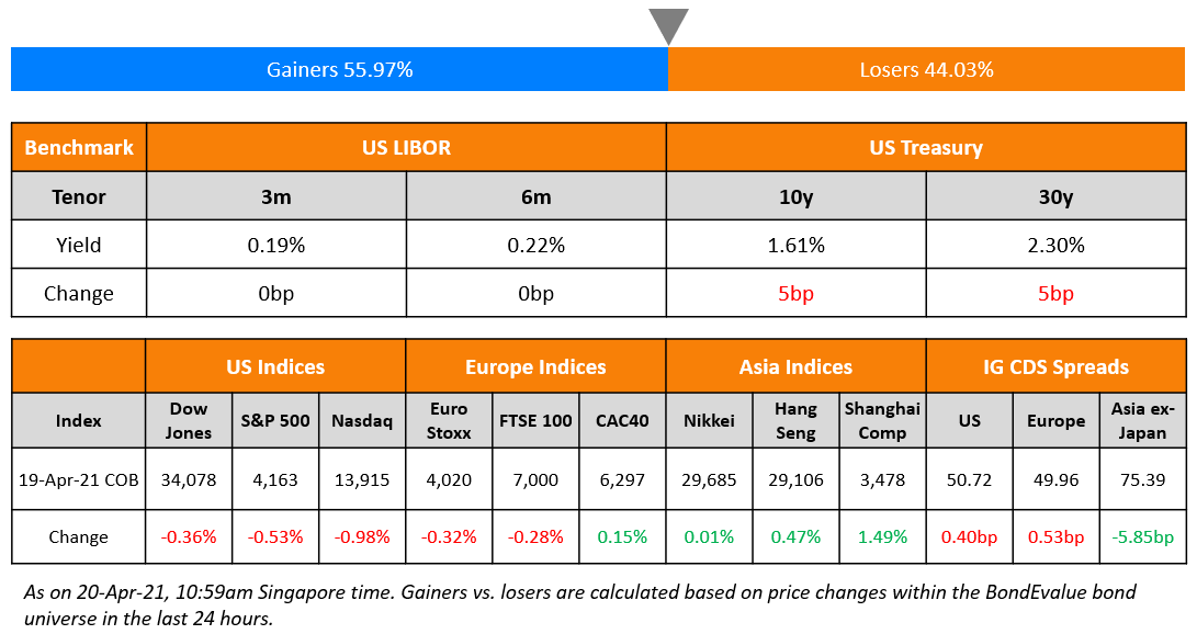 S&P fell 0.5% and Nasdaq was down 1% as equities slipped across the board. Tesla shares were down 3.4% after a fatal crash involving one of its autonomous cars. US10Y Treasury yields firmed 5bp to 1.61%. European equities also fell with DAX down 0.6% and FTSE down 0.3%. Prospects of a higher post-election government spending saw German Bund yields firm 3bp to -0.23%. US IG CDS spreads were 0.4bp wider and HY was 2.7bp wider. EU main CDS spreads were 0.5bp wider and crossover spreads tightened 3.6bp. Asian equity markets are muted today after Wall Street’s losses yesterday and Asia ex-Japan CDS spreads continue to tighten rapidly following easing of Huarong’s concerns, down 5.8bp.