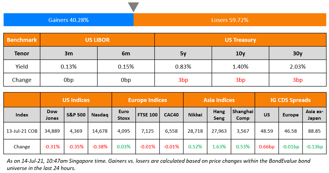 US Markets retreated from their early gains even after strong Q2 earnings from banking majors JPMorgan and Goldman Sachs (details below). S&P and Nasdaq were down ~0.4% with the fall spearheaded by Boeing’s 4.2% drop after the FAA reported a manufacturing quality issue on its 787 fleet (details below). Real Estate, down 1.3% and Consumer Discretionary down 1.2% led the drop while IT up 0.4% provided some support. Financials, Industrials and Energy were also down ~1%. US CPI rose to 0.9% MoM in June against a forecast of 0.5% – the largest one month change since June 2008. The inflation reading YoY came in at 5.4%, the highest in 13 years, vs. an estimate of 5.0%. The Core CPI, the index for all items less food and energy, rose 4.5% over the last year, the highest since 1991. US 10Y Treasury yields ended 3bp higher to 1.4% after the CPI release and a weak 30Y bond auction. European indices were broadly flat – DAX, CAC and FTSE down 0.01%. US IG and HY CDS spreads widened 0.7bp and 3.8bp respectively. EU main CDS spreads were flat while crossover spreads tightened 0.5bp. Brazil’s Bovespa was up 0.5%. Saudi TASI and Abu Dhabi’s ADX were up 0.4% and 0.3% respectively. Asian markets opened in the red – HSI and Shanghai were down 0.4%, Nikkei was down 0.2% and Singapore’s STI was down 0.1%. Asia ex-Japan CDS spreads were 0.1bp tighter.