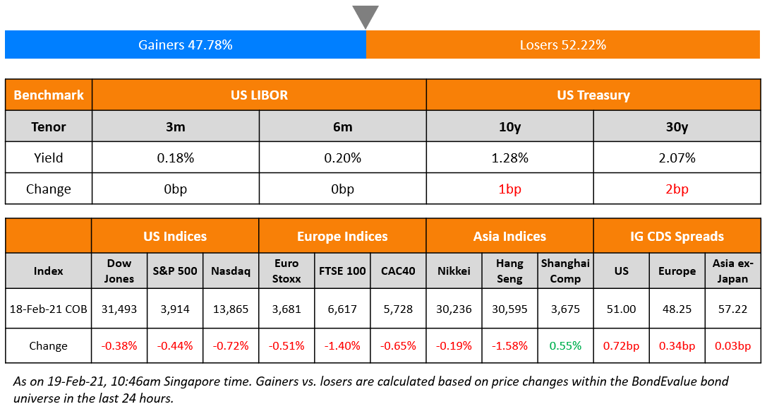 S&P and Nasdaq ended 0.4% and 0.7% lower after falling over 1.2% at the open. US 10Y Treasury yields were stable at 1.28%. Macro data came in weaker as US weekly initial claims rose to 861k, worse than forecasts of 765k. European indices also fell ~0.4% with the German Bund yields climbing 3bp to -0.34%. US IG CDS spreads were 0.7bp wider and HY was 4.6bp wider. EU main CDS spreads widened 0.3bp and crossover spreads widened 3.4bp. Asian equity markets have started softer echoing global equities, down 0.6-1% while Asia ex-Japan CDS spreads were flat.