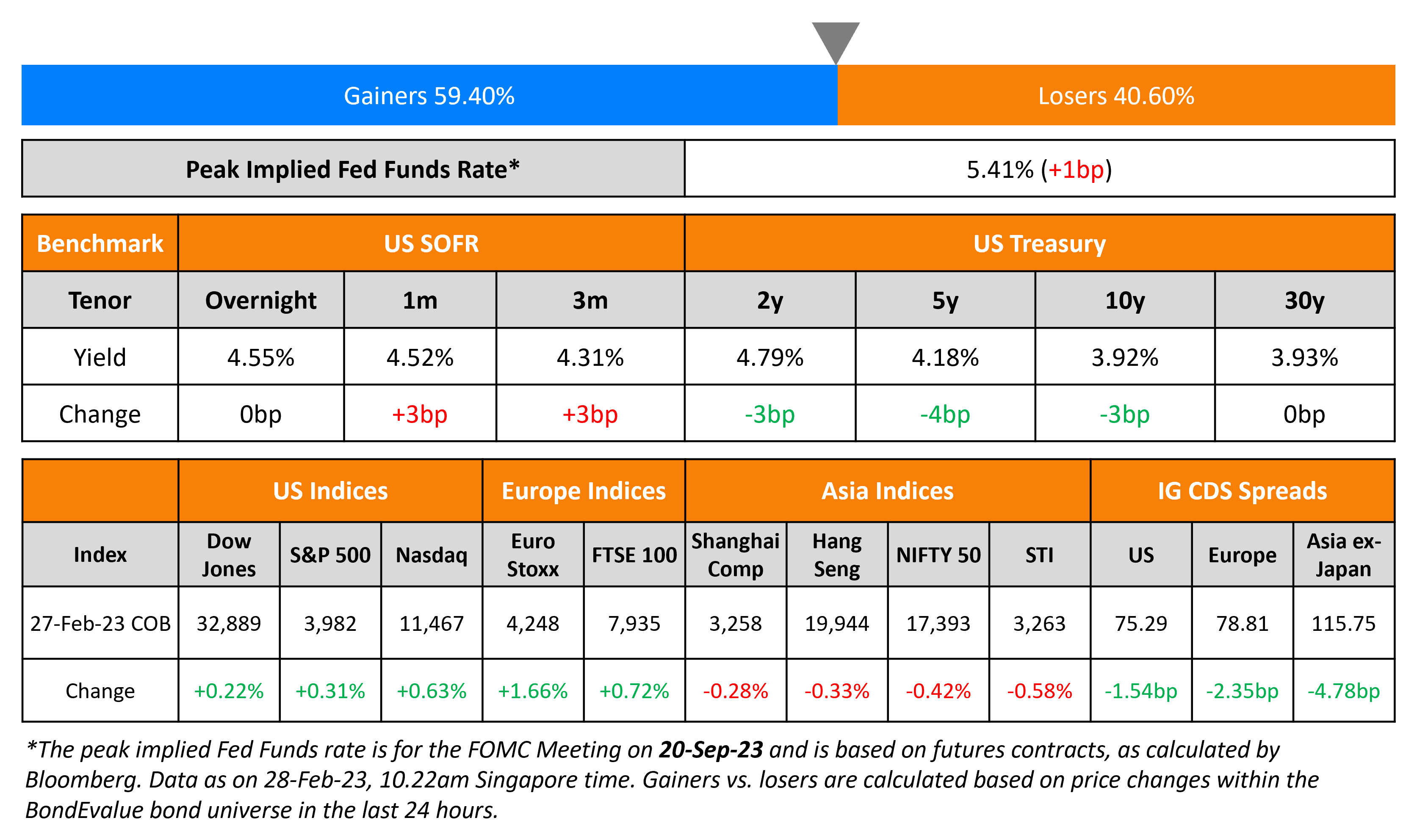US short-end Treasury yields were 3-4bp lower across the curve. The peak Fed funds rate inched another 1bp higher to 5.41% for the July 2023 meeting. Markets continue to price in a 25bp hike at each of the Fed’s next three meetings in March, May and June, based on the CME’s maximum probability calculations. US IG and HY CDS spreads tightened by 2.7bp and 7bp respectively. The S&P and Nasdaq ended the day higher, up by 0.3% and 0.6% on Friday.