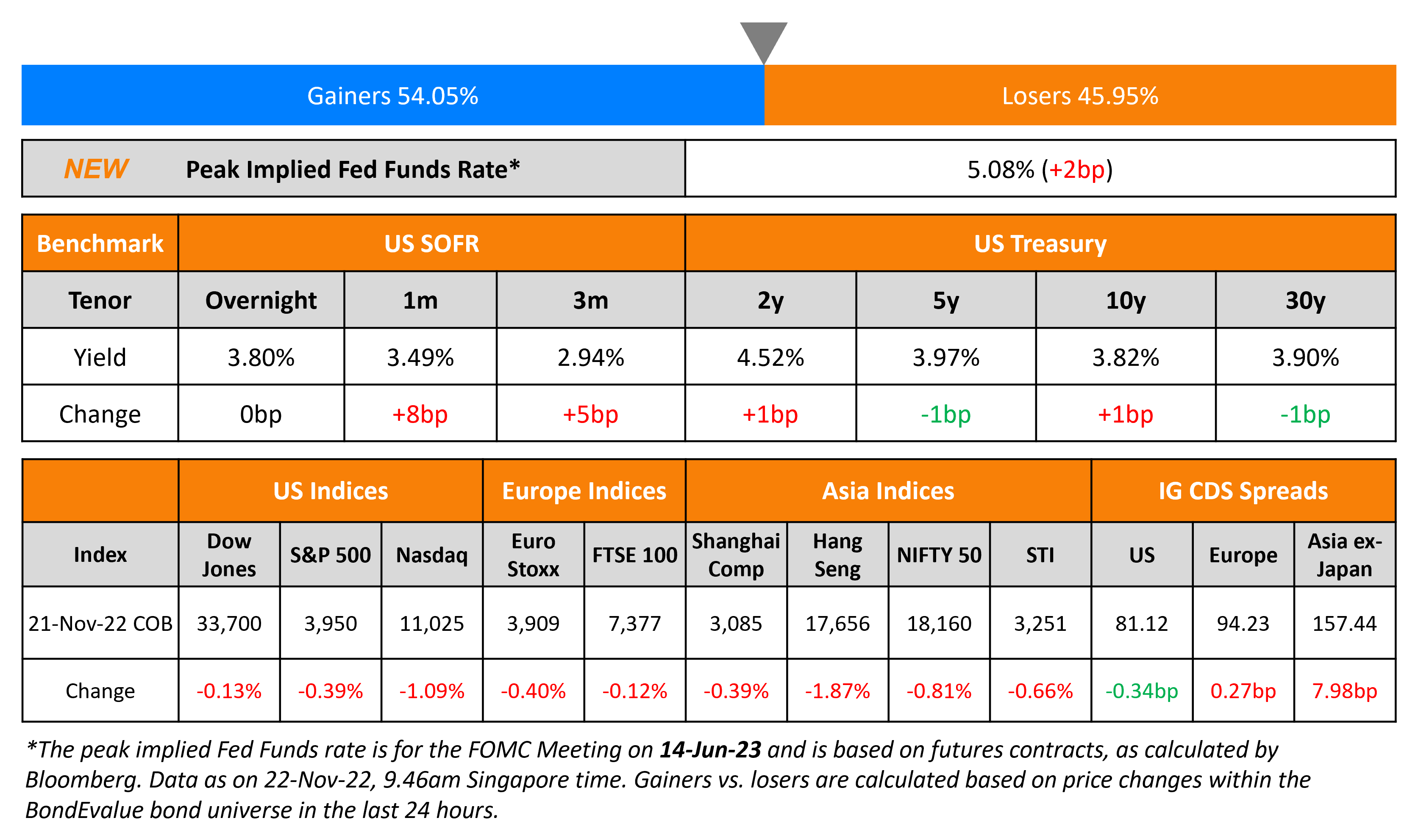 US Treasury yields were little changed across the curve yesterday. The peak Fed Funds rate was up 2bp to 5.08% for the June 2023 meeting. Federal Reserve’s Loretta Mester said that she does not have a problem with slowing down rate hikes from 75bp to 50bp in December. Meanwhile, another Fed governor Mary Daly said that she believes the impact of Fed hikes are likely bigger than what target rate implies, noting that financial markets are acting like the fed rate is ~6%. Probabilities of a 50bp hike at the FOMC’s December meeting currently stands at 76%. US IG CDS spreads tightened 0.3bp and HY spreads saw a 0.6bp tightening. US equity markets ended lower with the S&P and Nasdaq down 0.4% and 1.1%.