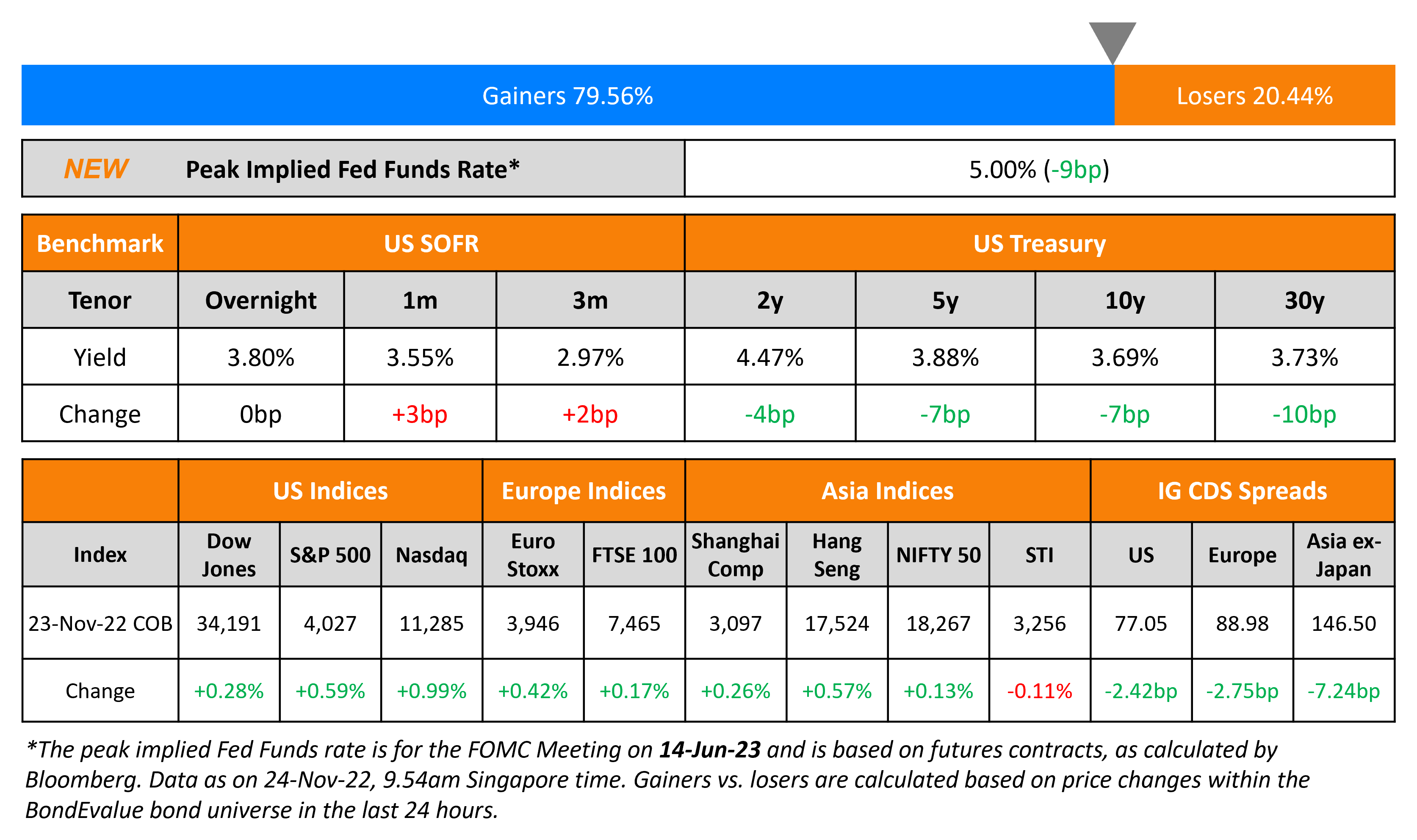 US Treasury yields moved lower with the the 30Y yield down 10bp while 2Y yields were down 4bp. The peak Fed Funds rate fell 9bp to 5% for the June 2023 meeting after the Fed’s November meeting minutes noted that a “substantial majority” believed that it would “likely soon be appropriate” to slow the pace of monetary tightening. This further raised prospects of a 50bp hike than a 75bp move in December. The probabilities of a 50bp hike at the FOMC’s December meeting currently stands at 76%. US IG CDS spreads tightened 2.4bp and HY spreads saw a 12.7bp tightening. US equity markets ended higher with the S&P up 0.6% and Nasdaq up 1%.