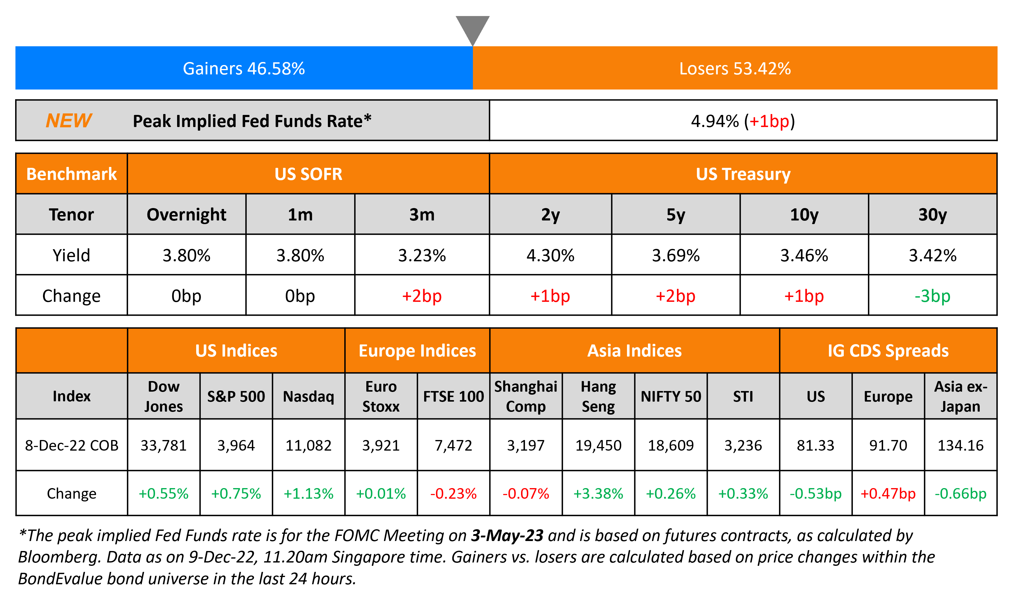 US Treasury yields were relatively quiet yesterday after easing for two days. The peak Fed Funds rate was 1bp higher to 4.94% for the May 2023 meeting. The probability of a 50bp hike at the FOMC’s December meeting remained steady at 76%. With the recent rally across bonds, David Bailin, CIO at Citi Global Wealth, said that bonds “deserve immediate attention” given expectations that 2023 will be one of the weakest years for global growth in last 40 years. He added that family offices and rich clients have been taking advantage of buying bonds lately. Similarly, Kelsey Berro, Fixed Income Portfolio Manager at JPMorgan Asset Management, also said that she believes bonds are back noting that it was the first time in a decade where bonds are offering sizeable “income and diversification”. US IG and HY CDS spreads tightened 0.5bp and 4.3bp respectively. US equity markets continued to move lower with S&P up 0.8% and Nasdaq up 1.1%.