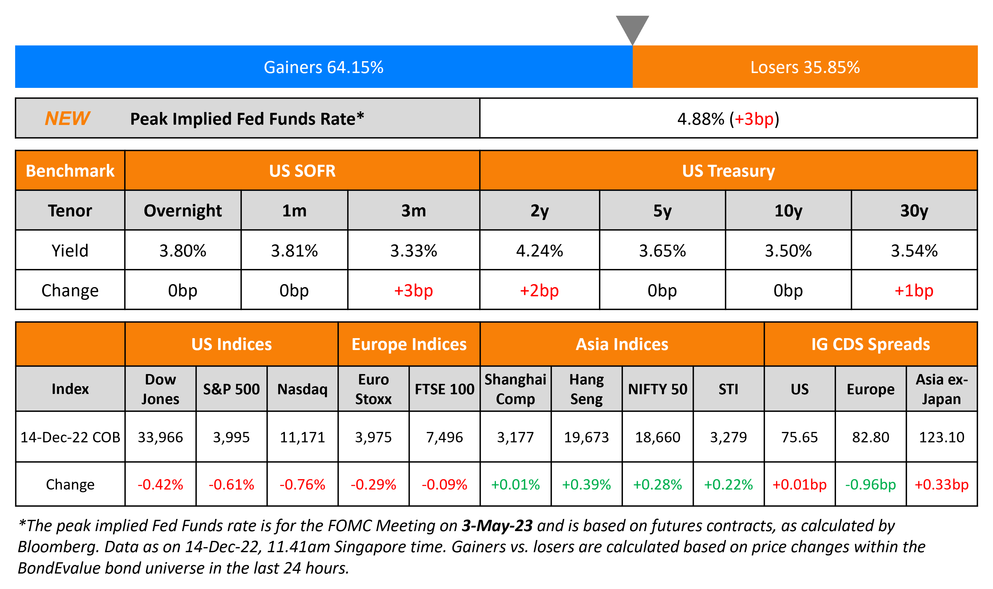 Markets on the other hand have priced in a milder rate hike path for the Fed with the probability of a 25bp hike at the February 2023 now at 76% vs. 35% before the inflation print while the probability of a 50bp hike at the same meeting has fallen to 24% from 51% earlier. The peak Fed funds rate was up 3bp to 4.88% for the May 2023 meeting. US IG CDS spreads were flat while HY CDS spreads widened 0.6bp. US equity markets fell with the S&P and Nasdaq down 0.6% and 0.8% respectively on Wednesday.