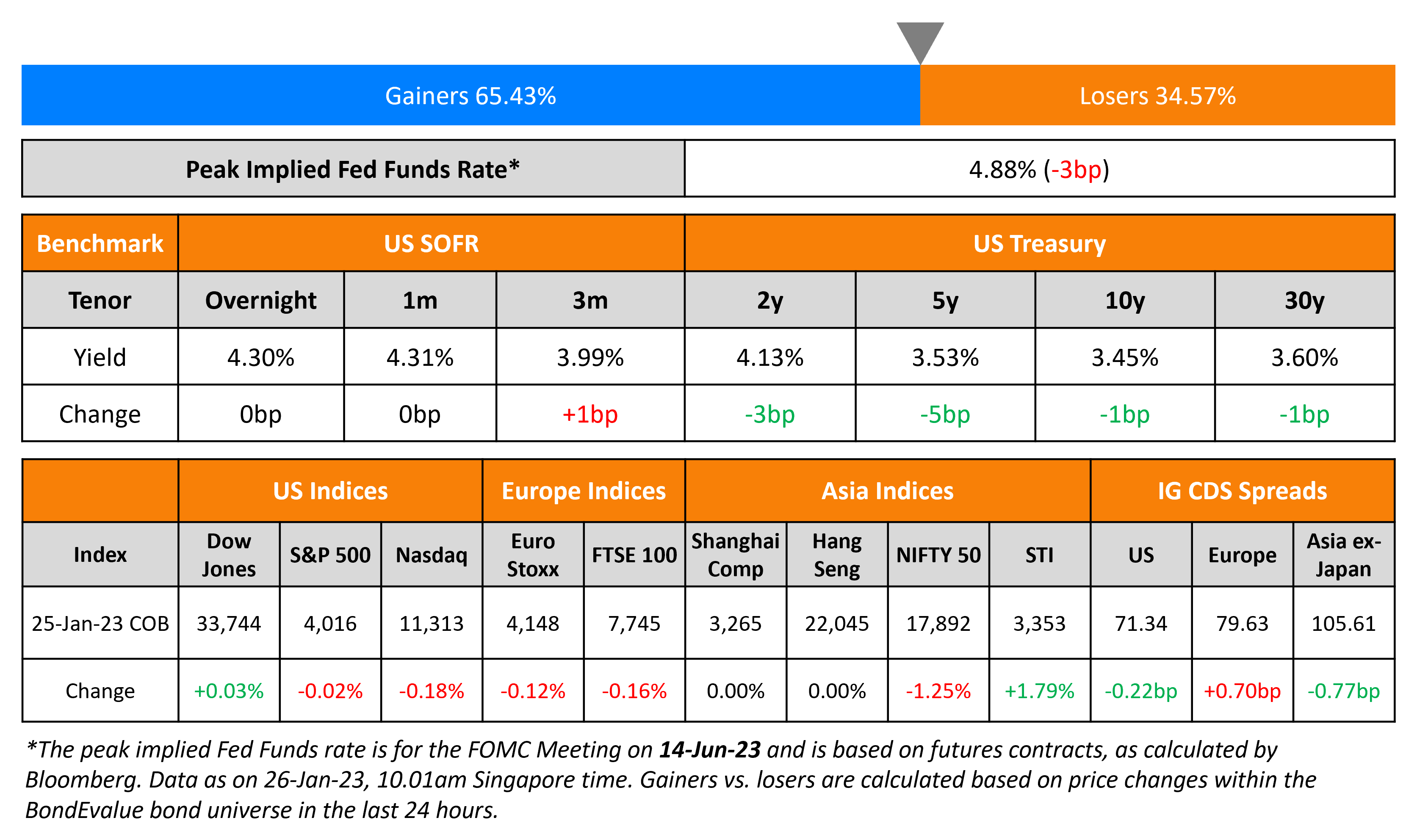 US Treasury yields were slightly lower across the curve on Wednesday. The peak Fed funds rate was 3bp lower at 4.88% for the June 2023 meeting. The probability of a 25bp hike at the FOMC’s February 2023 meeting stands at 99%. US equity markets ended slightly lower with the S&P and Nasdaq down 0.02% and 0.18%. US IG CDS spreads tightened by 0.2bp while HY spreads were 1.5bp wider. The Bank of Canada hiked its key interest rate to 4.5%, the highest in 15 years, and said that it would likely hold off regarding further increases.