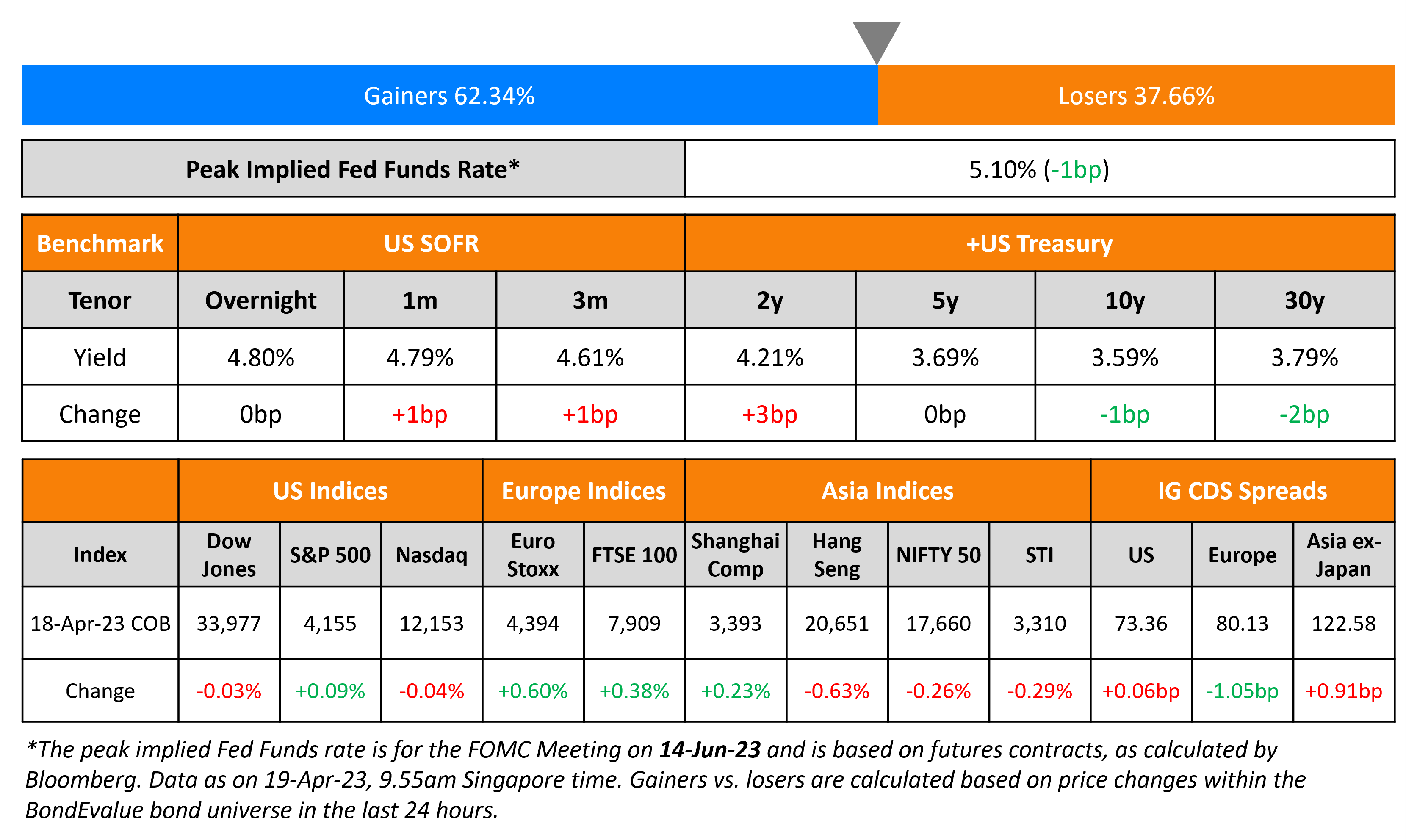 US Treasury yields were stable across the curve and the peak Fed funds rate was 1bp lower to 5.10% for the June meeting. The probability of a 25bp hike at the May meeting reduced slightly from 87% to 82%. US IG and HY CDS spreads widened 0.1bp and 3.3bp respectively. US equity indices were little changed – the S&P and Nasdaq broadly ended the day almost flat. BofA reported its fund manager survey results that showed investors are the most bearish on stocks vs bonds since 2009. Investors indicated that credit crunch fears had driven up bond allocation to a net 10% overweight, the highest since March 2009.