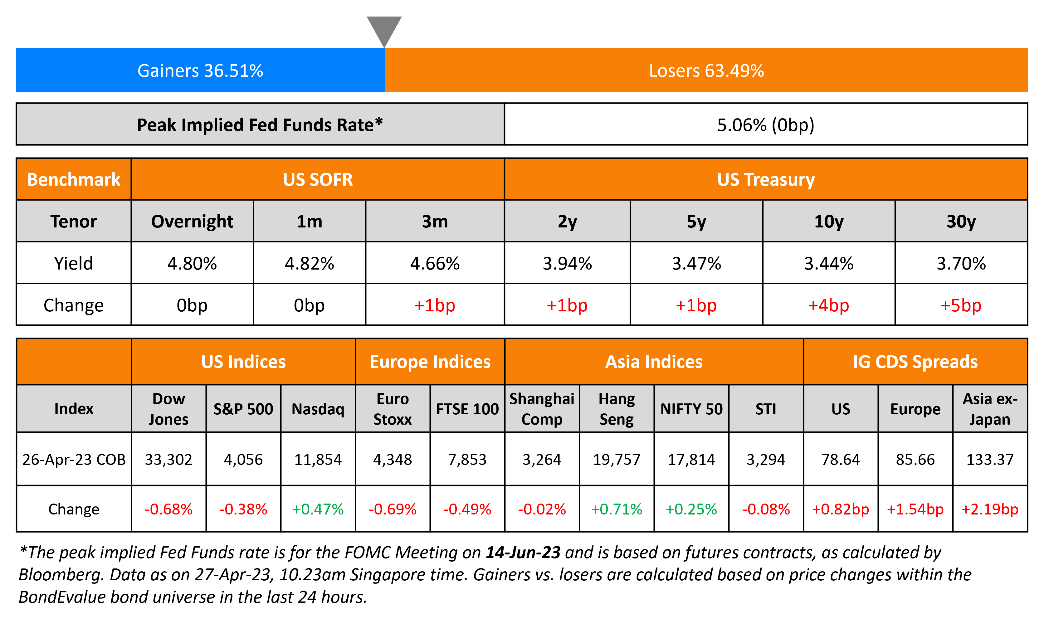 The Peak Fed funds was unchanged at 5.10% for the June meeting with CME probabilities continuing to indicate a 25bp hike in upcoming Fed’s May meeting, with a 73% probability. US IG and HY CDS spreads were wider by 0.8bp and 2.6bp respectively.
