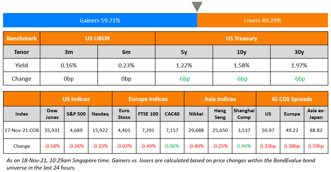 US equities ended lower with the S&P and Nasdaq down 0.3% each. Sectoral losses were led by Energy and Financials, down 1.7% and 1.1% each. US 10Y Treasury yields dropped 6bp to 1.58%. European markets were trading slightly weak with the DAX and CAC almost flat and the FTSE down 0.5% respectively. Brazil’s Bovespa ended 1.4% lower. In the Middle East, UAE’s ADX was down 0.2% and Saudi TASI was flat. Asian markets have opened broadly lower – Shanghai, HSI, and Nikkei were down 0.1%, 1.3%, 0.9% while STI was almost flat. US IG CDS spreads widened 0.3bp and HY CDS spreads were 3bp wider. EU Main CDS spreads were 0.4bp wider and Crossover CDS spreads were 1.9bp wider. Asia ex-Japan CDS spreads widened 0.6bp.