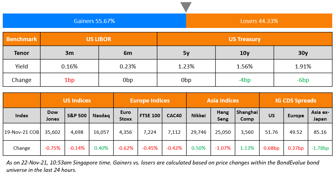 US equities ended mixed with the S&P down 0.1% and Nasdaq up 0.4%. Sectoral moves were led by IT, up 0.8% and Energy, down 3.9%. US 10Y Treasury yields were 4bp lower at 1.55%. European markets were trading slightly weak with the DAX, CAC and FTSE down 0.4-0.5% each. Brazil’s Bovespa ended 0.6% higher. In the Middle East, UAE’s ADX was up 0.1% and Saudi TASI was down 1.9% on Sunday. Asian markets have opened mixed – HSI and Nikkei were down 0.4% and 0.1% while Shanghai and STI were up 0.7% and 0.3% respectively. US IG CDS spreads widened 0.7bp and HY CDS spreads were 4.1bp wider. EU Main CDS spreads were 0.4bp wider and Crossover CDS spreads were 3.3bp wider. Asia ex-Japan CDS spreads tightened 1.8p.