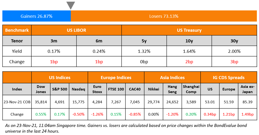 German Flash PMIs for November came stronger with Manufacturing and Services at 57.6 and 53.4, beating forecasts of 56.9 and 51.5 respectively. Eurozone Flash PMIs also came in higher with Manufacturing and Services at 58.6 and 55.8, well above forecasts of 57.3 and 53.2. Singapore’s GDP grew at 7.1% YoY in Q3 and is expected to grow at ~7% in 2021 and 3-5% next year, the Ministry of Trade and Industry (MTI) said. Singapore’s core inflation rose 1.5% in October, its biggest rise in nearly 3 years. Headline inflation jumped to 3.2% in October from 2.5% in the prior month. Food, airfares, private transport and accommodation picked up leading to the higher inflation print.