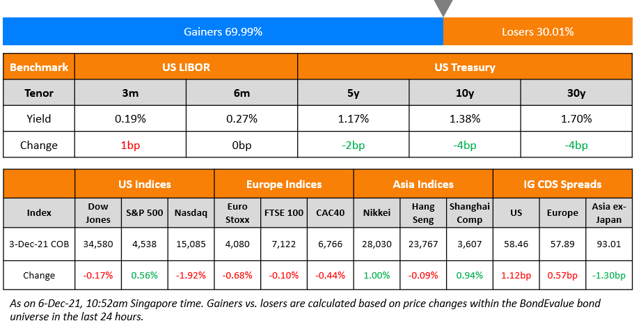 US equity markets dropped on Friday with the S&P and Nasdaq closing 0.8% and 1.9% lower respectively as Omicron jitters hit markets along with softer payrolls data. Most sectors were in the red led by Consumer Discretionary and IT, down over 1.7% each. US 10Y Treasury yields moved 4bp lower to 1.38% after falling over 10bp intra-day on Friday due to the risk-off sentiment and softer NFP data. European markets were lower too with the DAX, CAC and FTSE down 0.6%, 0.4% and 0.1% respectively. Brazil’s Bovespa was up 0.6%. In the Middle East, UAE’s ADX was closed while Saudi TASI was up 2.4% on Sunday. Asian markets have opened mixed – Shanghai and STI were up 0.4% and 0.8% while HSI and Nikkei were down 1.4% and 0.6% respectively. US IG CDS spreads widened 1.1bp and HY CDS spreads widened 7bp. EU Main CDS spreads were 0.6bp wider and Crossover CDS spreads were 2.4bp wider. Asia ex-Japan CDS spreads tightened 1.3bp.