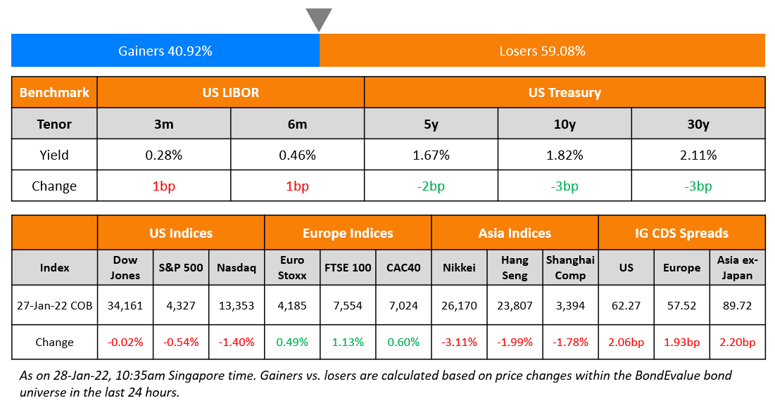 US Q4 GDP grew 6.9% and 2021 annual growth came at 5.7%, the strongest since 1984. US initial jobless claims fell by 30k to 260k. Dollar bonds of Ukraine and Russia moved higher on indications of easing tension where the Kremlin signaled despite it would be possible to continue a dialogue with the US over Ukraine.