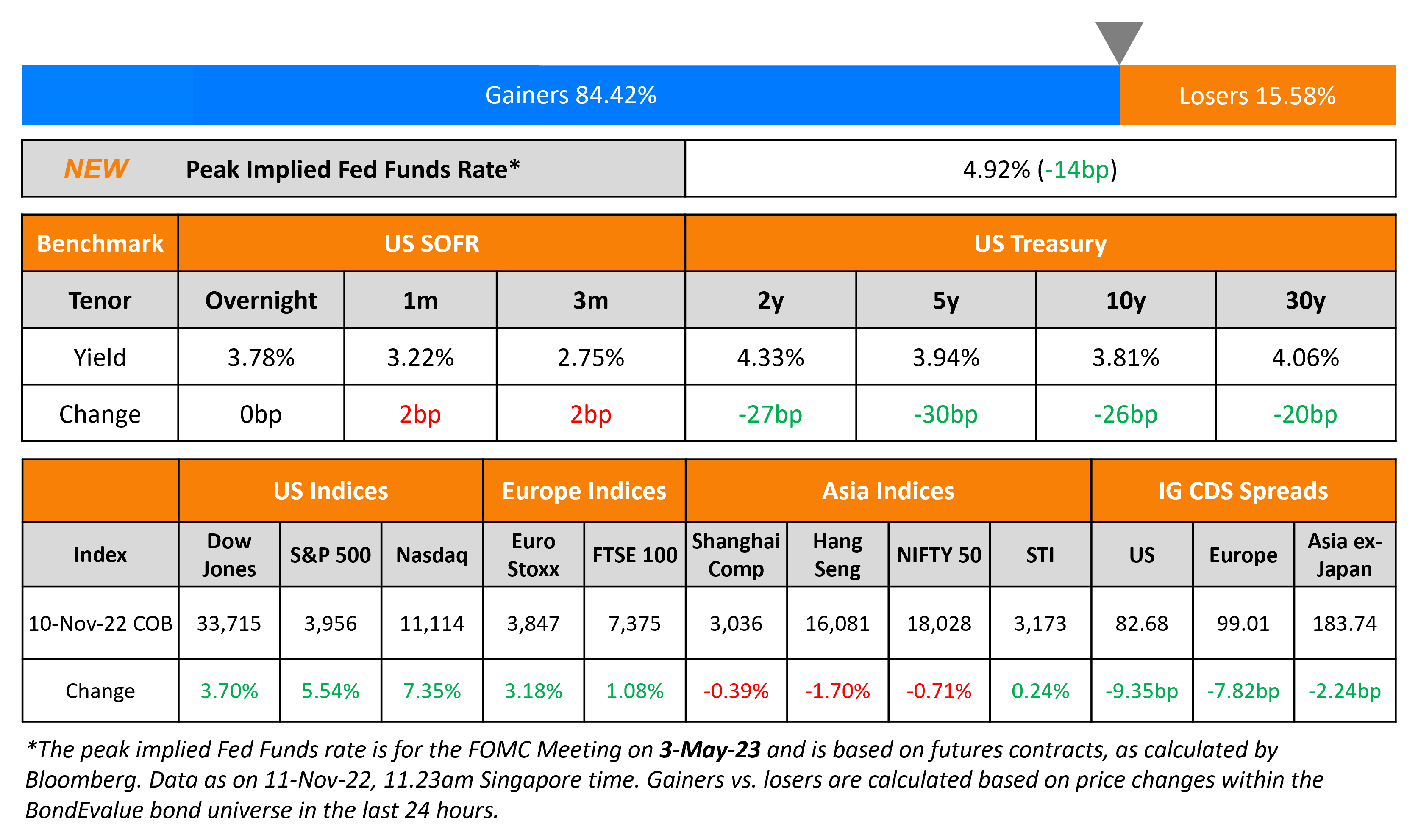The US Investment Grade dollar bond index saw its biggest single-day rally in over three decades as Treasuries rallied by 25-30bp across the curve after the better-than-expected inflation print. Some of the top gainers from yesterday’s rally included sovereigns like Egypt and Nigeria that saw its dollar bonds rise by over 5%. IG names including the likes of Apple, Amazon, Alphabet and others saw their bonds rise by over 3 points across the curve.