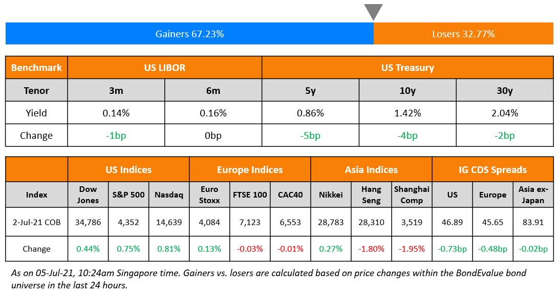US markets carved another day and week of gains on better than expected June Non-Farm Payroll (NFP) data before closing in for a long weekend to celebrate US Independence Day. NFP came in at 850k vs. the revised 583k last month and above the forecasted number of 720k. Unemployment was marginally higher at 5.9% vs. 5.8% last month. S&P and NASDAQ were up 0.8% creating new records. IT, Consumer Discretionary and Communications were up 1.4%, 1.1% and 0.9% pushing the bourses up. US 10Y Treasury yields were 4bp tighter to close at 1.42%. European markets were calm – DAX up 0.3% while FTSE and CAC were broadly flat. US IG and HY CDS spreads tightened 0.7bp and 3.7bp respectively. EU main and crossover CDS tightened 0.5bp and 2.8bp respectively. Saudi TASI and Abu Dhabi’s ADX were up 0.5% and 0.7% respectively. Brazil’s Bovespa reversed its losses to close 1.6% higher. Asian markets again had a mixed start – Singapore’s STI and Shanghai were up 0.3% and 0.2% respectively while Nikkei and HSI were down 0.6% and 0.1% respectively. Asia ex-Japan CDS spreads were flat.