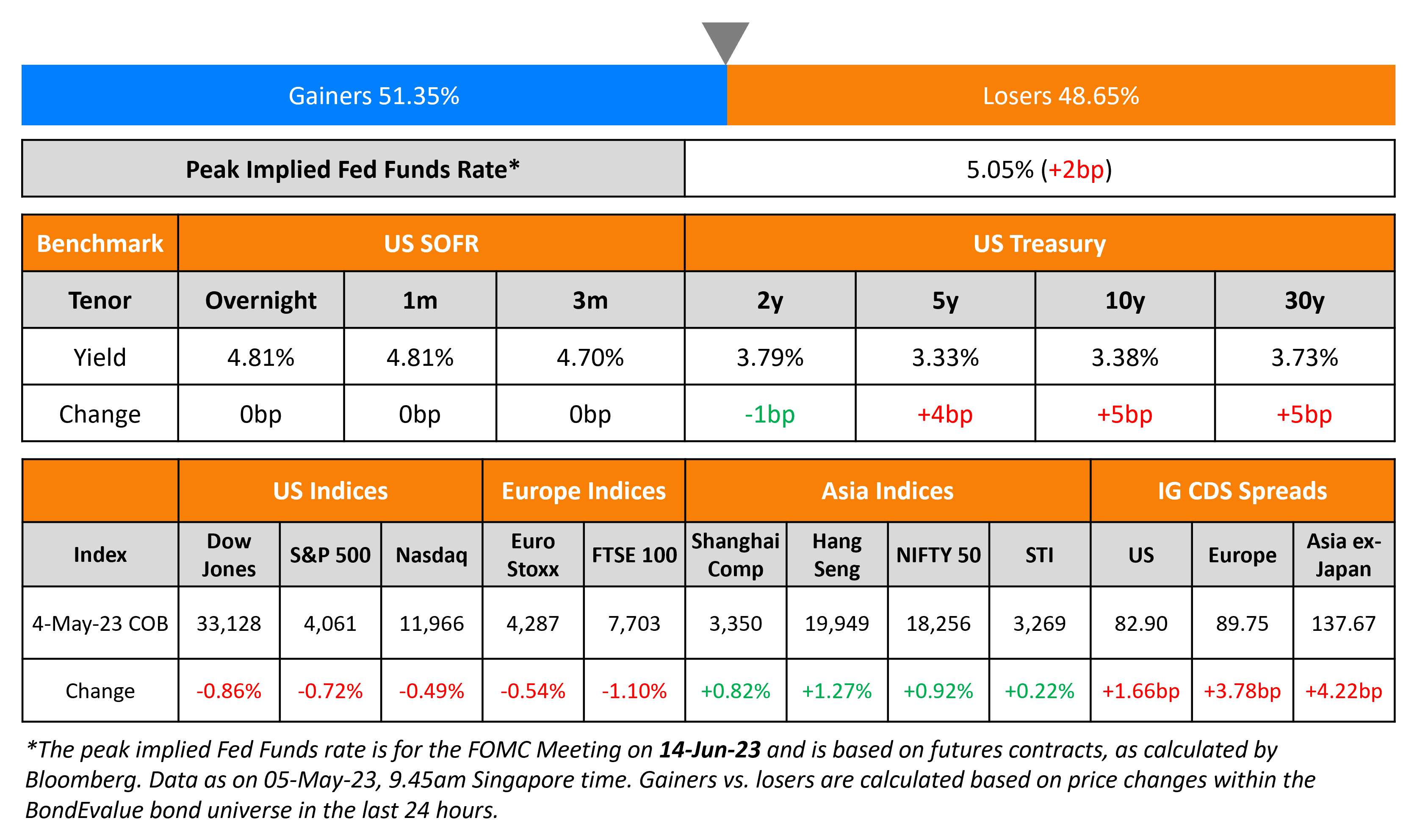Concerns over the US financial system continue to weigh on markets – PacWest Bancorp shares plunged over 50% after confirming it was considering options including a possible sale, while Western Alliance Bancorp closed over 38% in the red. Besides, Canada’s TD Group called off its $13.4bn acquisition of First Horizon Corp, triggering a 33% slump decline in the latter’s shares. The S&P 500 bank index dropped 2.8% and the broader US equity indices fell again – the S&P and Nasdaq were down 0.5-0.7%. US IG and HY CDS spreads were wider by 1.7bp and 9.8bp respectively.