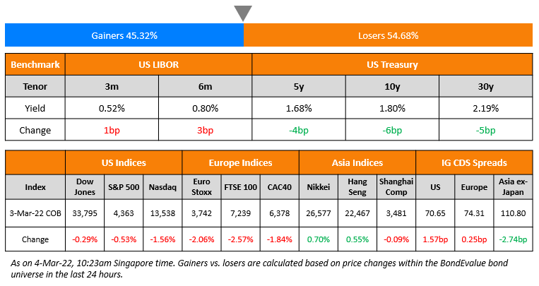 US equity markets ended lower on Thursday with the S&P and Nasdaq closing 0.5% and 1.6% lower each. Sectoral gains were led by Utilities, up 1.7% while losses were led by Consumer Discretionary, down 2.3%. European markets ended in the red too – DAX, CAC and FTSE were down 2.2%, 1.8% and 2.6% respectively. US 10Y Treasury yields fell 6bp to 1.80%. Brazil’s Bovespa ended flat. In the Middle East, UAE’s ADX was up 0.7% and Saudi TASI was up 0.8%. Asian markets have opened lower – Shanghai, HSI, STI and Nikkei were down 0.7%, 2.7%, 0.5% and 2.5% respectively. US IG CDS spreads widened 1.6bp and HY spreads were 6.9bp wider. EU Main CDS spreads were 0.3bp wider and Crossover CDS spreads were 10bp wider. Asia ex-Japan CDS spreads were 2.7bp tighter.