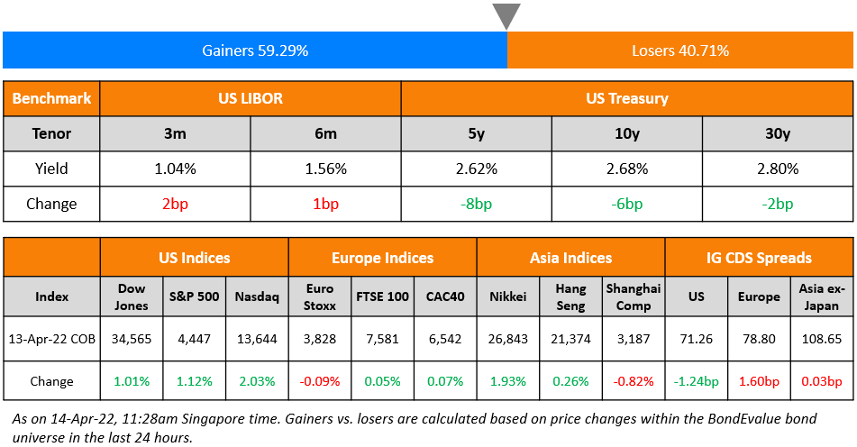Sembcorp Industries raised S$300mn via a 7Y sustainability-linked bond at a yield of 3.735%, 21.5bp inside initial guidance of 3.95% area. The bonds are unrated. Sembcorp has a sustainability performance target of achieving greenhouse gas emissions intensity to 0.40 tCO2e/MWh or lower by end-2025. If not achieved, there will be a one-time 25bp coupon step-up on or after April 1, 2026. Sembcorp Financial Services is the issuer while the Temasek-owned parent is the guarantor. Proceeds will be for general corporate purposes and debt refinancing.