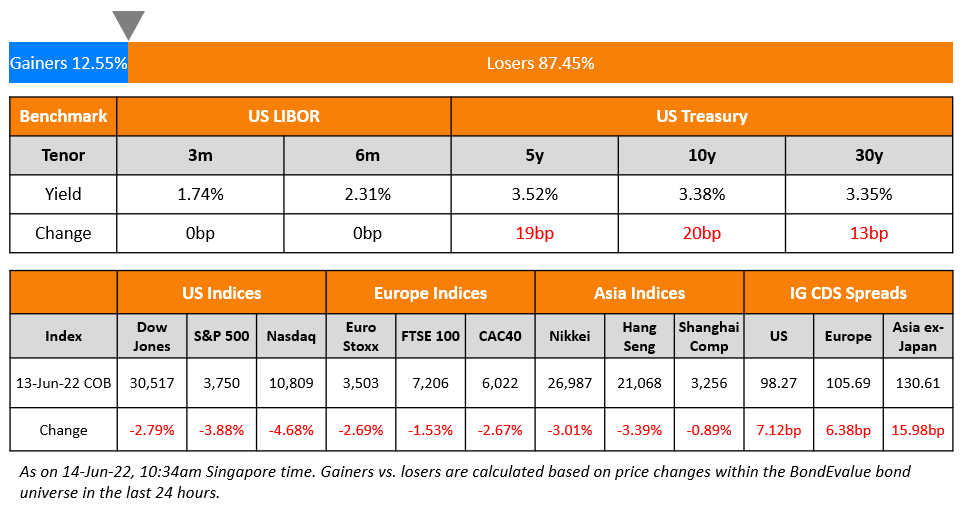 The negative sentiment in equities comes as the probability of a 75bp hike by the Fed in Wednesday’s FOMC meeting has jumped to 96% currently, from just over 3% a week earlier (as per CME data), on the back of a record 8.6% CPI print on Friday.