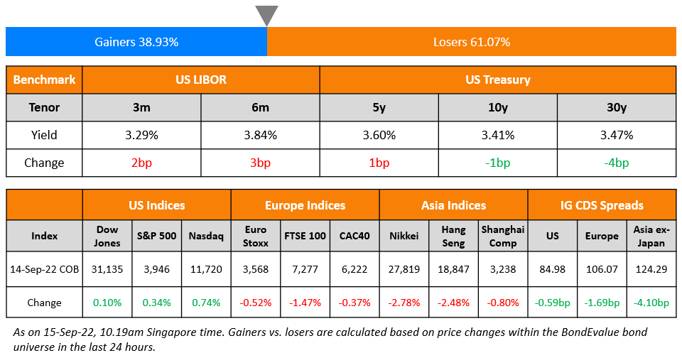 Market activity in the US was relatively muted with the US 10Y Treasury yields 1bp lower at 3.41%. US equity markets ended slightly higher on Wednesday after the massive CPI release-led sell-off a day earlier – S&P and Nasdaq rose 0.3% and 0.7% respectively. US IG CDS spreads tightened 0.6bp and US HY spreads narrowed 6.9bp. US mortgage interest rates rose above 6% for first time since 2008 and have doubled in the last one year as aggressive rate hikes by the Fed have weighed on mortgage lending. European markets were in the red with the DAX, CAC and FTSE down 1.2%, 0.4% and 1.5% respectively. EU Main CDS spreads tightened 1.7bp and Crossover spreads were 5.7bp tighter. The EU proposed a plan to cap revenues of electricity producers making windfall profits. It said that levies worth $140bn could be imposed and this would be distributed across its member states – the funds would help those suffering from higher energy prices. Separately, France has capped electricity and gas price hikes at 15% for the upcoming year and thus budgeted a $16bn net cost to the state.