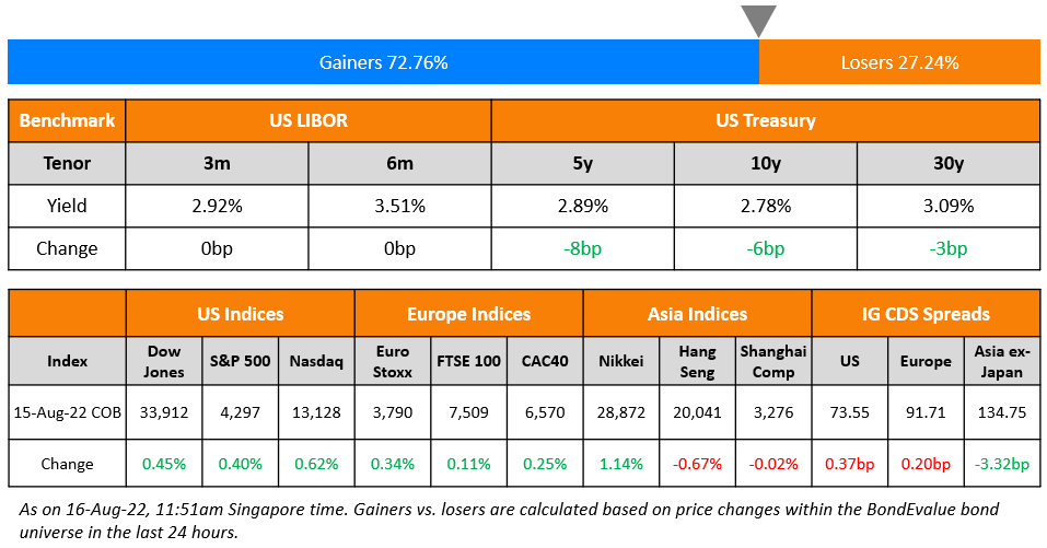 China’s central bank, the PBoC unexpectedly cut key interest rates for the second time in 2022 and withdrew some cash from the banking system to support its slowing pandemic-hit economy. The PBoC cut rates by 10bp to 2.75% on its RMB 400bn ($59.3bn) one-year medium term lending facility (MLF) to financial institutions. This came close on the heels of soft macro data from the mainland – China retail sales rose 2.7% YoY in July, way below estimates of 5% and lower vs. June’s 3.1%. Industrial production was up 3.8% YoY, slower than expectations of 4.6% (3.9% in June). YTD, fixed asset investment was up 5.7% YoY, missing expectations of 6.2%. Meanwhile, in Nigeria inflation surged to 19.6% in July against estimates of 19.4% and 18.6% in June. Inflation trended to a 17-year high on high commodity prices, transport costs and supply shortages.