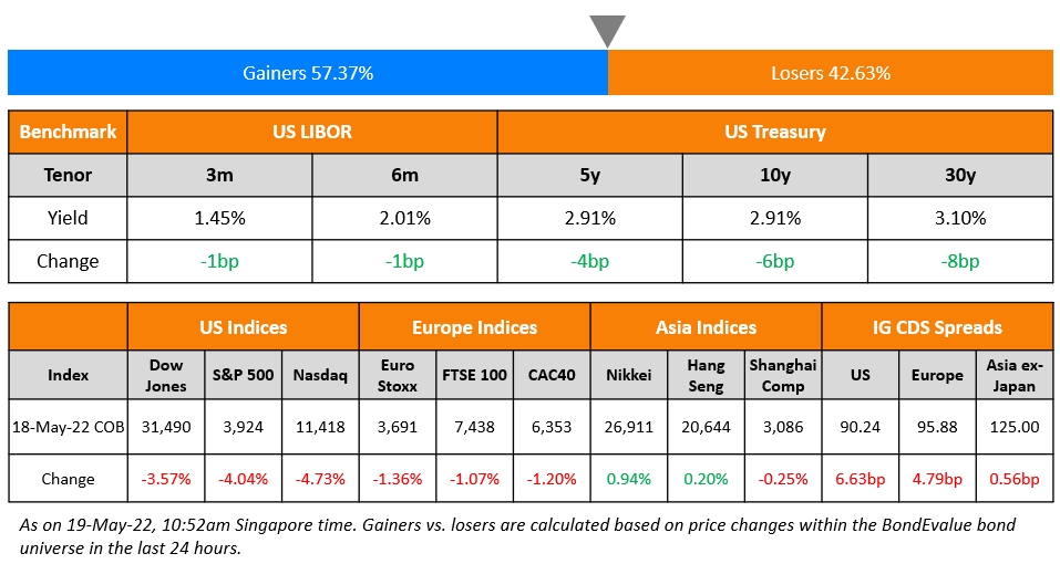 US equity markets saw a massive sell-off on Wednesday with the S&P down 4% and Nasdaq down 4.7%. Sectoral losses were led by Consumer Staples and Consumer Discretionary, down over 6% each. US 10Y Treasury yields fell 6bp to 2.91% on the overall risk-off sentiment that took hold of markets. European markets were lower too with the DAX, CAC and FTSE down 1.3%, 1.2% and 1.1%. Brazil’s Bovespa closed 2.3% lower. In the Middle East, UAE’s ADX was up 1.4% while Saudi TASI rose 0.2%. Asian markets have opened lower – Shanghai, HSI, STI and Nikkei were up 0.1%, 2.3%, 0.3% and 2.1% respectively. US IG CDS spreads widened 6.6bp and HY spreads widened 34.8bp. EU Main CDS spreads were 4.8bp wider and Crossover spreads were 26.2bp wider. Asia ex-Japan CDS spreads were 0.6bp wider.