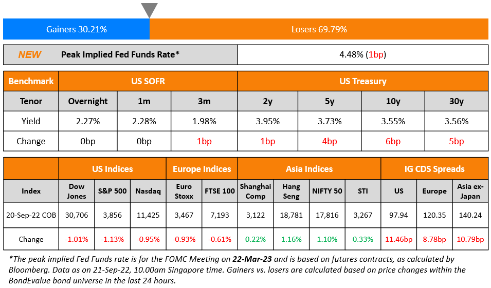 US 10Y Treasury yields rose 6bp to 3.55% while the 2Y was up 1bp to 3.95%. The peak Fed Funds Rate currently stands at 4.48% for the FOMC’s March 2023 meeting. US credit markets saw a sharp widening with IG CDS spreads higher by 11.5bp and US HY spreads higher by 14.6bp. Negative sentiment continues to weigh on risk assets ahead of the FOMC meeting later today. Markets are now pricing in an 82% probability of a 75bp hike and an 18% probability of a 100bp hike later today. Download the BondEvalue Mobile App to receive a push notification on the FOMC decision in real-time.