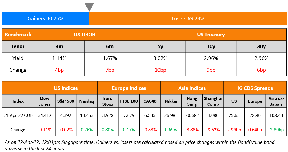 The S&P and Nasdaq ended sharply lower, down 1.5% and 2.1% respectively with all sectors in the red, led by Energy, down over 3.1%. US 10Y Treasury yields shot up 9bp to 2.96%, led by the front-end of the curve where the the 2Y yield jumped 15bp after Powell’s hawkish comments. European markets closed higher with the DAX and CAC up 1% and 1.4% while FTSE was flat. Brazil’s Bovespa was closed. In the Middle East, UAE’s ADX was up 1.2% and Saudi TASI was down 1%. Asian markets have opened with a negative bias – Shanghai, HSI and Nikkei were down 0.1%, 0.6% and 1.8% while STI was flat. US IG and HY CDS spreads widened 3bp and 14.1bp respectively. EU Main spreads were 0.6bp wider and Crossover spreads were 4.3bp wider. Asia ex-Japan CDS spreads were 2.8bp tighter.