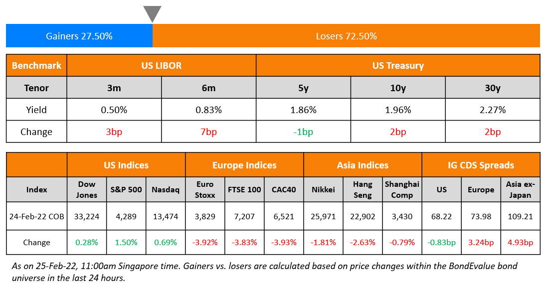 US equity markets ended strong after opening with sharp losses on Thursday. S&P ended 1.5% higher and Nasdaq reversed its 3.5% intraday losses to end 3.3% higher. The US 10Y Treasury yields moved higher to 1.96% after the risk-off sentiment initially saw it fall down 10bp yesterday morning on the back of Russia’s “military operation” in Ukraine (scroll below for details). European markets were relatively steady yesterday – DAX was down 4%, CAC was down 3.8 % and FTSE was down 3.9%. Brazil’s Bovespa closed 0.4% lower. In the Middle East, UAE’s ADX was flat and Saudi TASI was down 1.8%. Asian markets have opened with a positive bias – Shanghai, STI and Nikkei are up 0.5%, 0.9%, 1.3% and HSI was down 0.1%. US IG CDS spreads tightened 0.8bp and HY spreads were 11.1bp wider. EU Main CDS spreads were 3.2bp wider and Crossover CDS spreads were 17.8bp wider. Asia ex-Japan CDS spreads were 4.9bp wider.