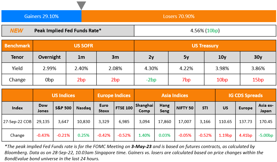 Long-term US Treasury bond yields continued to rise on Tuesday with the 10Y up 10bp to 3.98% and the 30Y up 15bp to 3.86%. The peak Fed Funds Rate currently stands at 4.56% for the FOMC’s May 2023 meeting, having eased 10bp yesterday. US credit markets saw a widening of CDS spreads, with IG widening by 1.2bp and HY moving sharply higher by 38.5bp. US equity markets were mixed with the S&P down 0.2% while Nasdaq closed 0.3% higher. European equity markets were broadly weaker by ~0.5% and credit markets saw EU Main CDS spreads rise by 4.4bp and Crossover spreads move 15.2bp higher. Moody’s has warned that the UK government’s plans for unfunded tax cuts could lead to a higher budget deficit and higher interest rates, thereby impacting UK’s credibility with investors and termed it as ‘credit negative’. The UK 30Y gilt yield touched 5% for the first time in two decades. Subsequently, GBP-denominated corporate bonds have also taken a hit; for example, Prudential’s 2051s fell 3.1 points and British Telecom’s 2039s slipped by 4.9 points on Tuesday. Asia ex-Japan CDS spreads narrowed by 5bp and Asian equity markets have opened in the red, down ~1-2%.