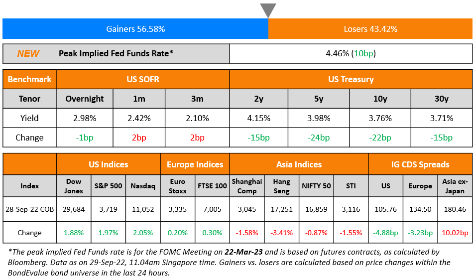 US Treasury yields fell sharply on Wednesday as buy-side flows took over, following the BoE’s announcement on purchases of UK gilts. The US 10Y yield declined 22bp to 3.76% and the 5Y yield dipped 24bp to 3.98%. The peak Fed Funds Rate currently stands at 4.46% for the FOMC’s March 2023 meeting, having eased by 10bp. Subsequently, US credit markets saw a tightening of CDS spreads, with IG narrowing by 4.9bp and HY moving 31.1bp lower. US equity markets ended stronger yesterday with the S&P and Nasdaq up 2% and 2.1% respectively.