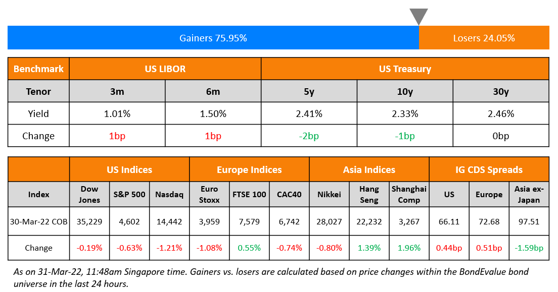 Malaysian state-owned shipping company MISC raised $1bn via a two-tranche deal. It raised $400mn via a 3Y bond at a yield of 3.651%, 45bp inside the initial guidance of T+160bp area. It also raised $600mn via a 5Y bond at a yield of 3813%, 45bp inside the initial guidance of T+180bp area. The bonds have expected ratings of Baa2/BBB (Moody’s/S&P). The bonds are issued by wholly owned subsidiary MISC Capital Two (Labuan), and guaranteed by the parent. The proceeds from the Singapore and Malaysia-listed trade will be used for general corporate purposes, including capex, working capital and refinancing.
